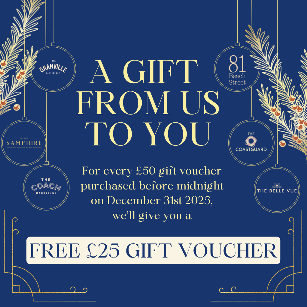 Free £25 Voucher T&Cs This offer is valid on £50 gift vouchers purchased before midnight on 31st December 2025. Your free voucher is valid Monday to Thursday between 12th January 2026 – 26th February 2026. Free vouchers will be emailed within 3 working days of purchasing a £50 voucher. Vouchers can be used at 81 Beach Street, The Coastguard, The Granville, The Coach, The Belle Vue and Samphire, and can’t be used with our daily set menu or any other offers/events. Maximum two free vouchers can be used per booking. Any remaining balance on the voucher won’t carry over after you use it – it’s a one-time use so please use the full amount when redeeming. If you haven’t received your voucher, please check your Junk Folder before contacting us – they sometimes hide in there!
