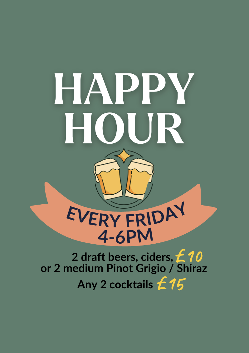 Join us for Happy Hour every Friday from 4-6pm, where you can enjoy two draft beers, ciders, or medium Pinot Grigio / Shiraz wine for only £10...and any two cocktails for only £15!